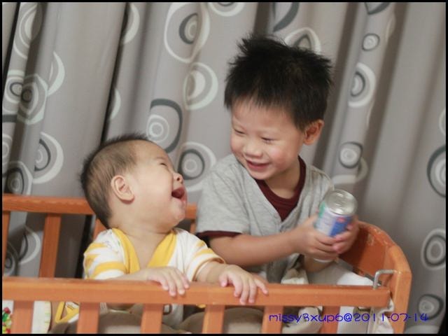 因為認識晴媽跟蔥媽,所以一直都很期待兩隻小鬼可以鬧成一片的情景。 前些陣子幾乎都是桓兒的自作多情,兄有情弟無意。 一直到現在,終於兩兄弟會互動了。 往往只要我在忙,跟桓兒說:桓弟弟哭…