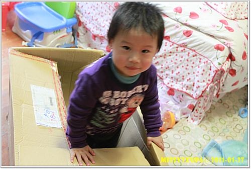 欸??這箱子是幹麼的??超級大!!連桓兒整個躲在裡面還有超多多餘空間的喔! 甚至他還好好的坐在箱子裡面看電視,玩玩具唷! 這台汽座外面有一個很大的收納袋子,袋子上面也打上了他的品牌…